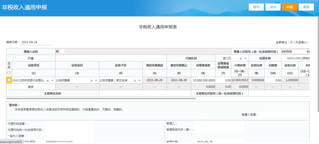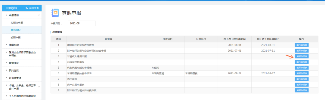 1.企业身份登录电子税务局,选择【我要办税】→【税费申报及缴纳】→【其他申报】→【非税收入通用申报表】,点击填写申报表。