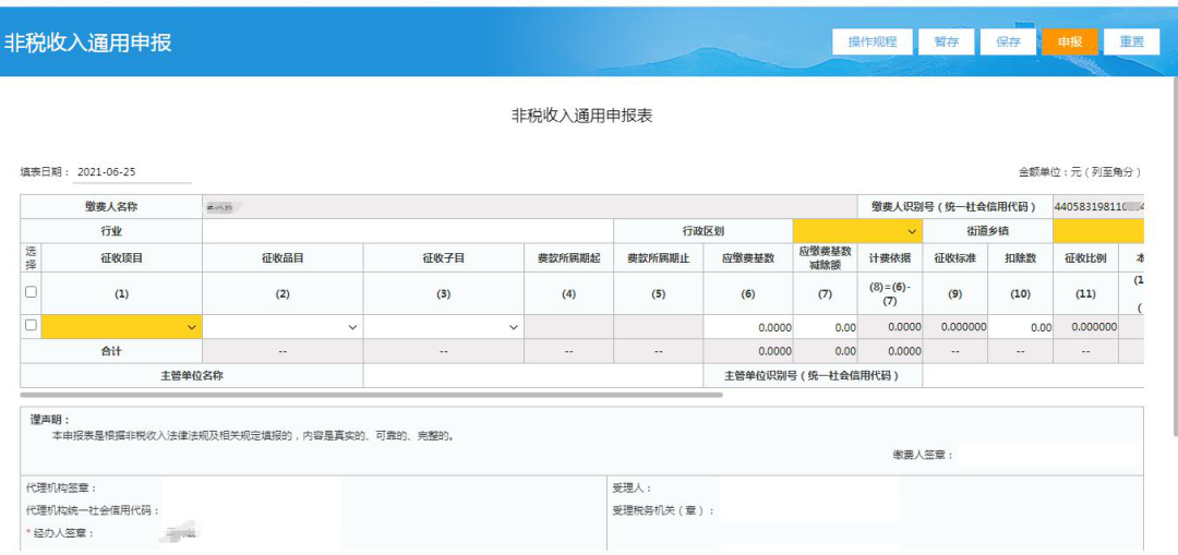 2.进入申报表后,选择“征收项目”、“征收品目”、“征收子目”,勾选要申报的行次,填写数据后,点击【申报】按钮。