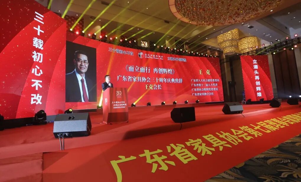 9月13日,以“三十载初心不改,立潮头再创辉煌”为主题的广东省家具协会成立三十周年庆典在广州隆重举行。庆典上,广东省人大社会建设委员会委员、省十三届人大代表、省社会组织党委委员、省家具协会会长王克以《而立而行 再创辉煌》为题致答谢词。