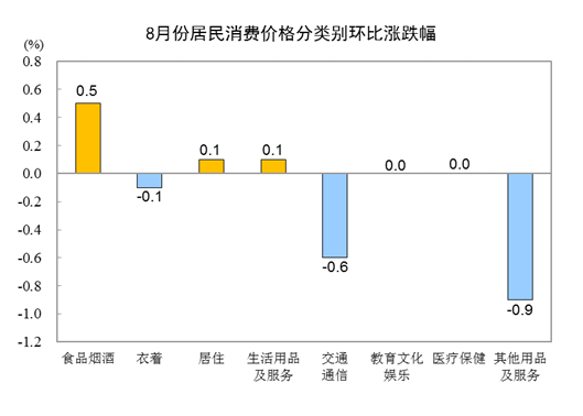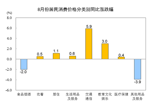 8月份,食品烟酒类价格同比下降2.0%,影响CPI(居民消费价格指数)下降约0.58个百分点。食品中,畜肉类价格下降27.1%,影响CPI下降约1.20个百分点,其中猪肉价格下降44.9%,影响CPI下降约1.09个百分点;鲜菜价格下降1.5%,影响CPI下降约0.03个百分点;蛋类价格上涨13.9%,影响CPI上涨约0.08个百分点;水产品价格上涨11.7%,影响CPI上涨约0.21个百分点;鲜果价格上涨5.0%,影响CPI上涨约0.08个百分点;粮食价格上涨0.8%,影响CPI上涨约0.01个百分点。其他七大类价格同比六涨一降。其中,交通通信、教育文化娱乐、居住价格分别上涨5.9%、3.0%和1.1%,生活用品及服务、衣着、医疗保健价格分别上涨0.6%、0.5%和0.4%;其他用品及服务价格下降3.9%。