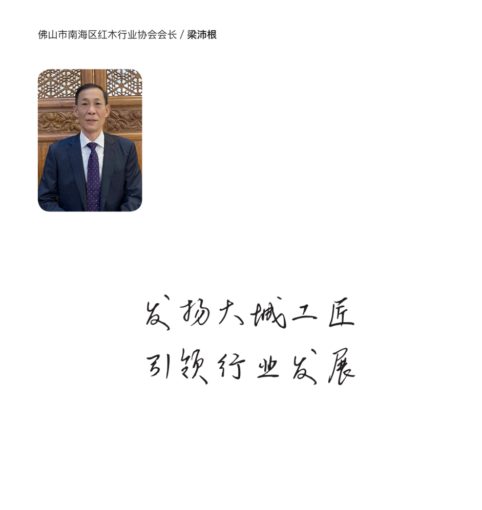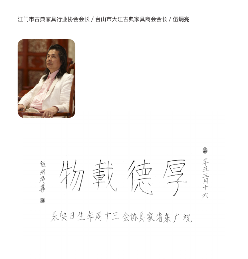 2021年,在广东省家具协会成立三十周之际,乐从家具协会会长黎顺能、佛山市海南区家具行业协会会长廖顺南、佛山市南海区红木行业协会会长梁沛根、江门市古典家具行业协会会长/台山市大江古典家具商会会长伍炳亮纷纷发来贺词表示祝贺。