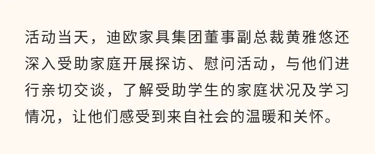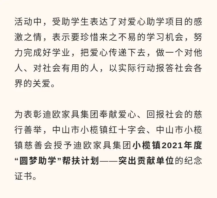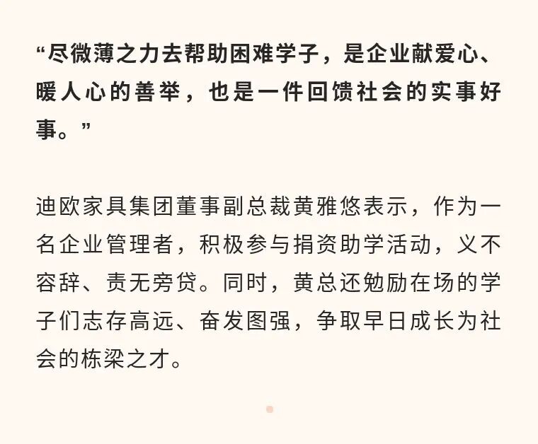 国之大计,教育为本。未来,迪欧家具集团将会一如既往地支持我国教育扶贫事业的发展,以实效履行责任担当,影响和带动更多的企业家和社会各界爱心人士传递和凝聚社会正能量,为困难家庭学子点亮未来的希望。