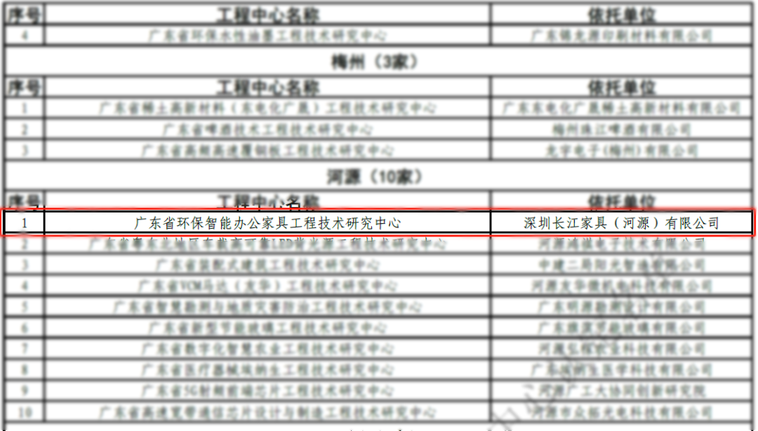 除本次省级认定外,长江家具的办公家具工程技术研究中心在2020年度已荣获河源市科学技术局颁发的河源市工程技术研究中心认定,并荣获河源市工信局、财政局、税务局、海关联合颁发的河源市市级企业技术中心认定。
