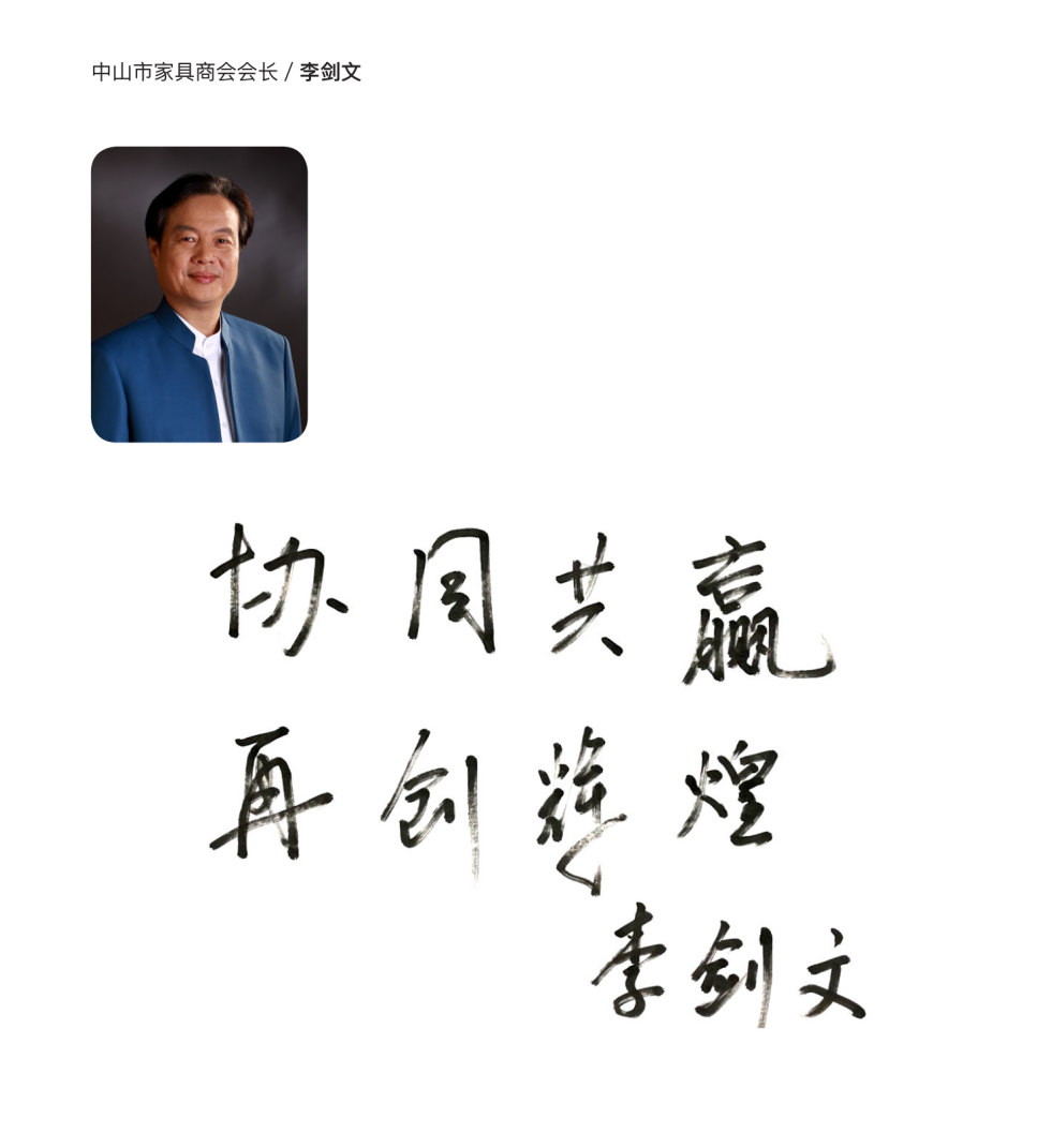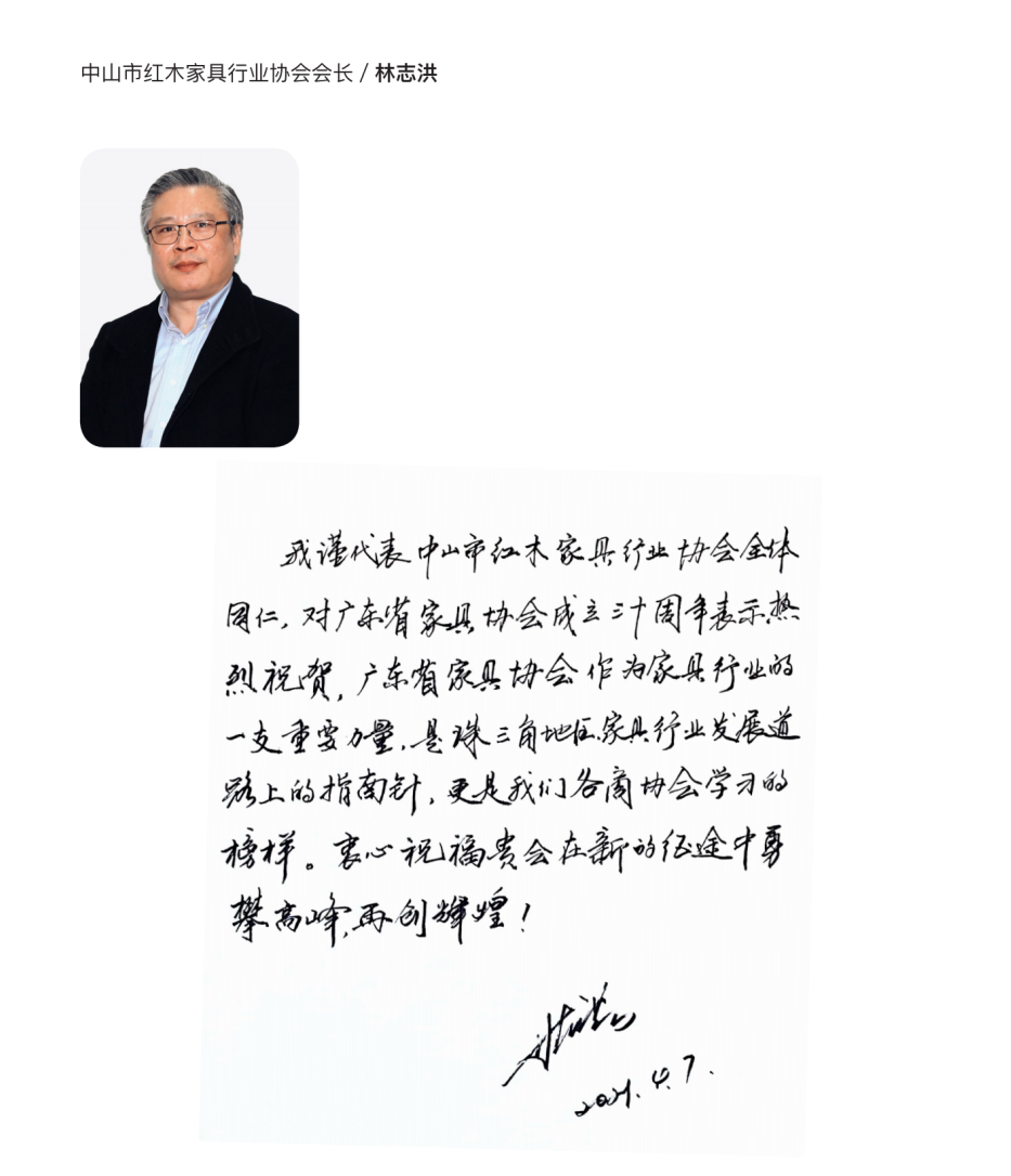 2021年,在广东省家具协会成立三十周之际,东莞市大岭山家具协会会长任作辉、中山市家具商会会长李剑文、中山市办公家具行业协会会长/广东省湖北商会家居协会会长姚永红、中山市红木家具行业协会会长林志洪纷纷发来贺词表示祝贺。