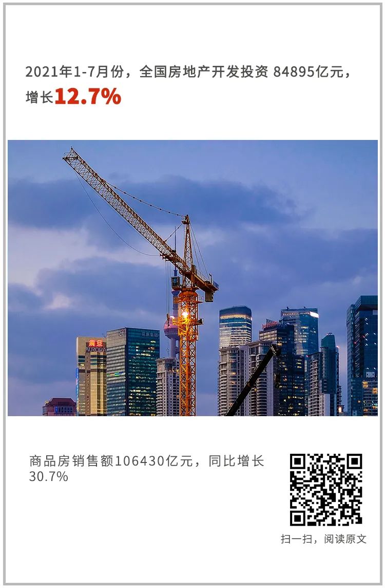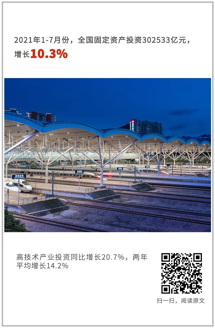 1-7月份,全国固定资产投资(不含农户)302533亿元,同比增长10.3%,比1-6月份回落2.3个百分点,两年平均增长4.3%;7月份环比增长0.18%。分领域看,1-7月份基础设施投资同比增长4.6%,两年平均增长0.9%,比1-6月份回落1.5个百分点;制造业投资同比增长17.3%,两年平均增长3.1%,比1-6月份加快1.1个百分点;房地产开发投资同比增长12.7%,两年平均增长8.0%,比1-6月份回落0.2个百分点。全国商品房销售面积101648万平方米,同比增长21.5%;商品房销售额106430亿元,同比增长30.7%。