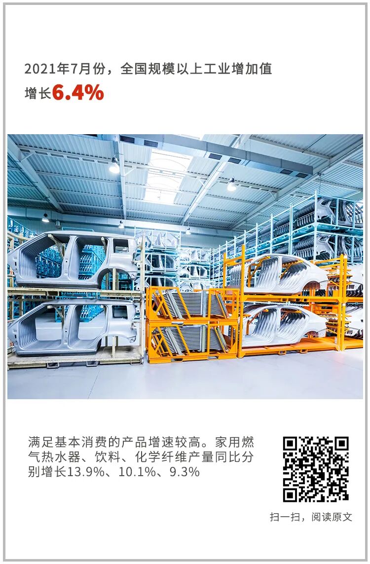 高技术制造业和装备制造业增加值同比分别增长15.6%、6.4%,两年平均分别增长12.7%、9.7%。分产品看,新能源汽车、工业机器人、集成电路、微型计算机设备产量同比分别增长162.7%、42.3%、41.3%、10.3%,两年平均增速均超过14%。满足基本消费的产品增速较高。家用燃气热水器、饮料、化学纤维产量同比分别增长13.9%、10.1%、9.3%。分经济类型看,国有控股企业增加值同比增长7.2%;股份制企业同比增长7.1%,外商及港澳台商投资企业同比增长3.8%;私营企业同比增长6.1%。1-7月份,全国规模以上工业增加值同比增长14.4%,两年平均增长6.7%。其中,医药制造业、电气机械和器材制造业增加值同比分别增长29.3%、26.2%。7月份,中国制造业采购经理指数为50.4%,连续17个月高于临界点;企业生产经营活动预期指数为57.8%。1-6月份,全国规模以上工业企业实现利润总额42183亿元,同比增长66.9%,两年平均增长20.6%;规模以上工业企业营业收入利润率为7.11%,比2020年1-6月份提高1.66个百分点。 二、服务业继续恢复,企业营业收入增速总体较快