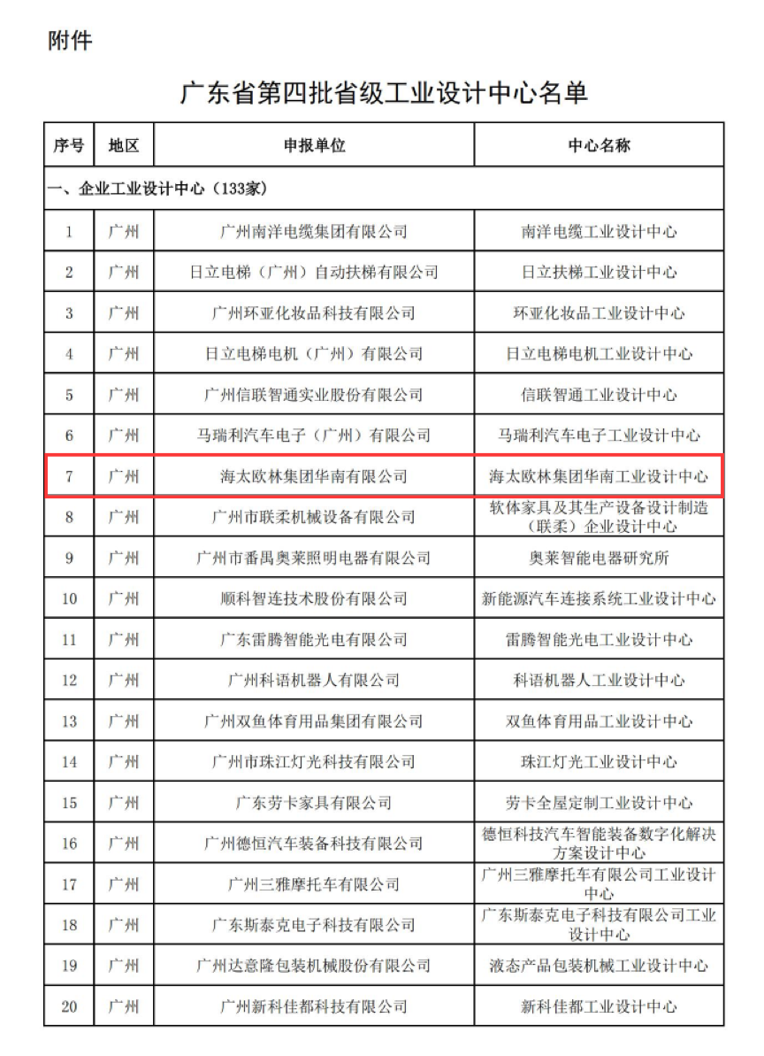 6月30日,广东省工业和信息化厅公布了广东省第四批省级工业设计中心名单,广东省家具协会副会长单位、海太欧林集团华南工业设计中心被认定为广东省工业设计中心。经企业自愿申报、各地级以上市工业和信息化主管部门推荐、专家评审和网上公示等程序,广东省工业和信息化厅确定海太欧林集团华南有限公司等139家单位为广东省第四批省级工业设计中心。