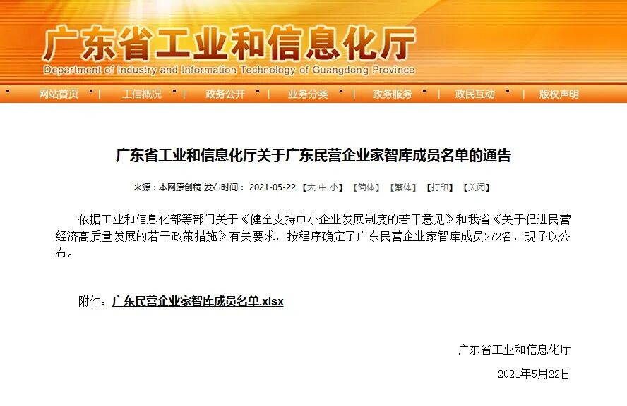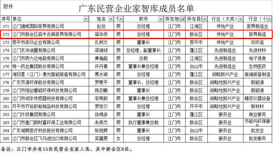 2021年5月22日,广东省工信厅发布了《关于广东民营企业家智库成员名单的通告》,全省共有272名民营企业家入选“广东民营企业家智库成员”,江门市新会区森木古典家具有限公司总经理蒋华侨光荣入选。