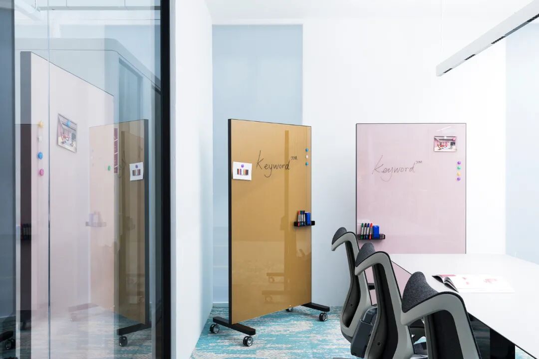 为了配合办公培训和教学场景的大面积书写需求,keyword几何设计师深入观察实际使用场景,设计出一系列多尺寸、可组合使用的挂墙写字板,贴合使用者的真实使用需求。同时,该系列丰富靓丽的色彩也能成功为空间注入活力,营造向上的、积极的空间氛围。
