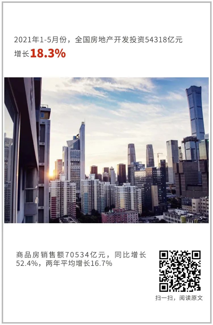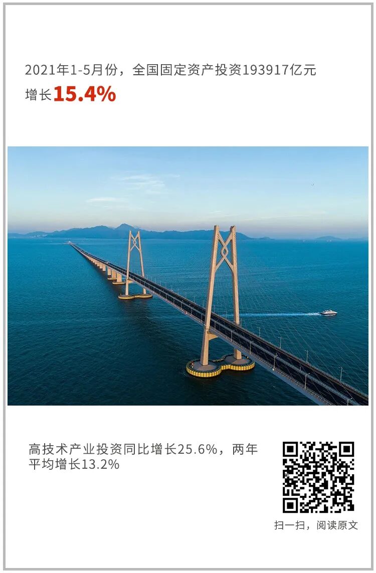 1-5月份,全国固定资产投资(不含农户)193917亿元,同比增长15.4%,两年平均增长4.2%;5月份环比增长0.17%。分领域看,1-5月份基础设施投资同比增长11.8%,两年平均增长2.6%;制造业投资同比增长20.4%,两年平均增速由1-4月份下降转为增长0.6%;房地产开发投资同比增长18.3%,两年平均增长8.6%。全国商品房销售面积66383万平方米,同比增长36.3%,两年平均增长9.3%;商品房销售额70534亿元,同比增长52.4%,两年平均增长16.7%。