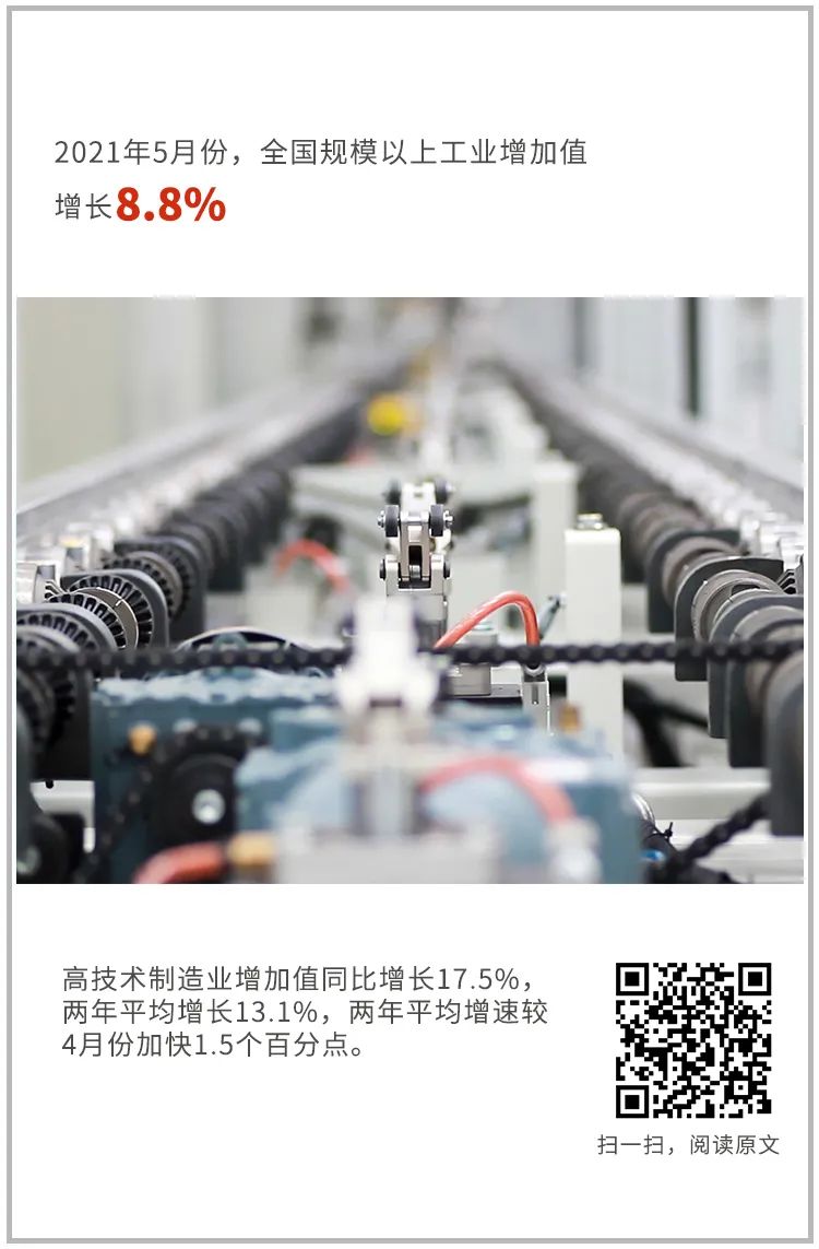 5月份,全国规模以上工业增加值同比增长8.8%,两年平均增长6.6%;环比增长0.52%。分三大门类看,采矿业增加值同比增长3.2%,两年平均增长2.1%;制造业同比增长9.0%,两年平均增长7.1%;电力、热力、燃气及水生产和供应业同比增长11.0%,两年平均增长7.2%。