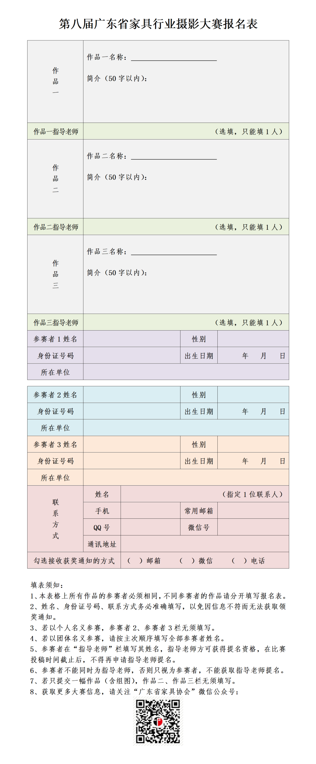 5、提交:提交作品时须一并提交《参赛报名表》电子版,《参赛报名表》请于“广东家具网”www.chinagdf.com.cn下载。参赛者务必如实填写报名表上各项信息,若以团体名义参赛,请按主次顺序填写全部参赛者姓名。