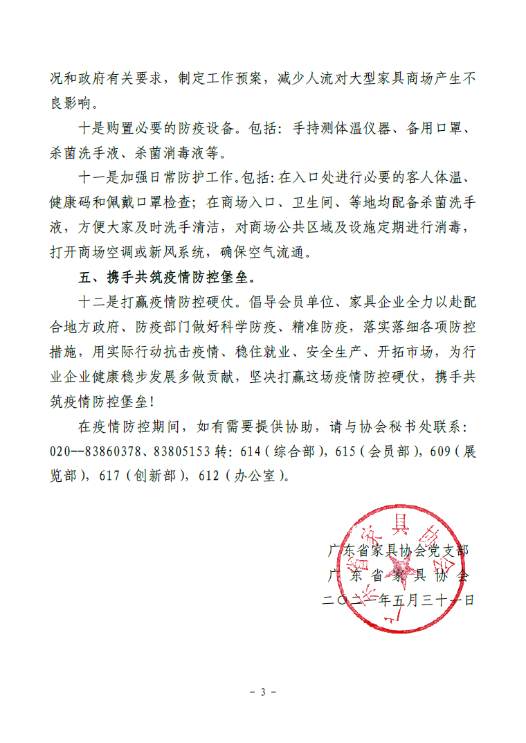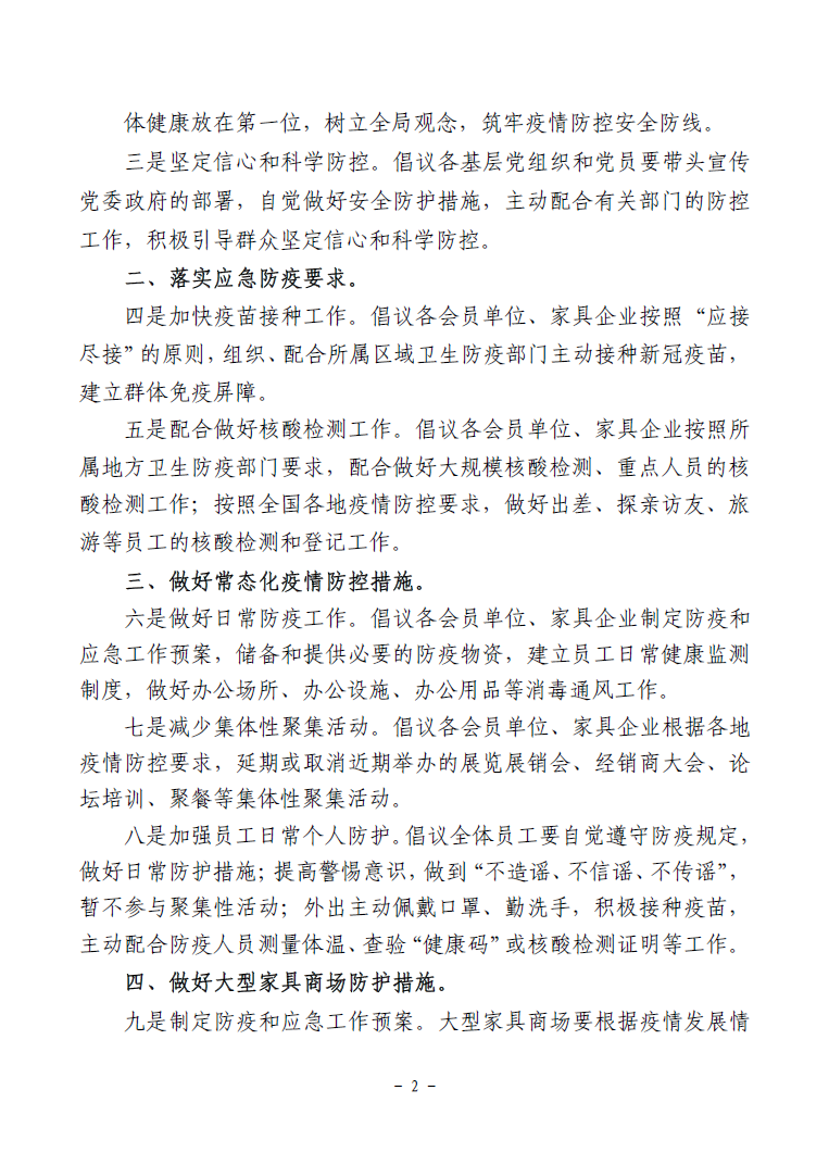二是筑牢疫情防控安全防线。倡议各会员单位、家具企业进一步增强疫情防控的政治责任感和工作紧迫感,坚持“以大概率思维应对小概率事件”,高度重视疫情常态化防控工作,把员工的生命安全和身体健康放在第一位,树立全局观念,筑牢疫情防控安全防线。