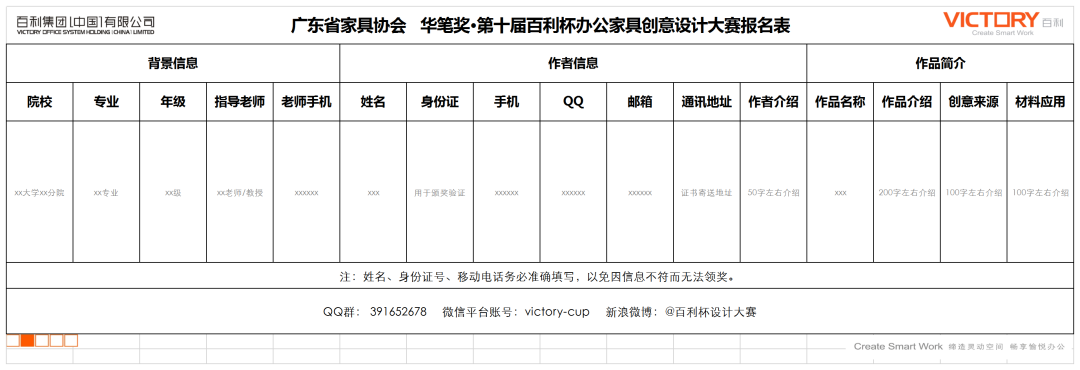 1)参赛必须填写《第十届百利杯·办公家具设计大赛报名表.xls》(请登陆“广东家具网www.chinagdf.com.cn”下载填写)。