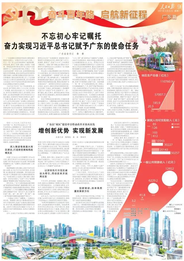 广东是拥有光荣革命传统和光辉发展历程的红色热土。回望百年伟大奋斗历程,一代又一代广东儿女在党的领导下披荆斩棘、攻坚克难,谱写了革命、建设、改革的广东篇章。特别是改革开放40多年来,在党中央坚强领导下,广东率先改革开放,实现从一个农业省向全国第一经济大省、全球重要制造基地的历史性跨越,成长出深圳这样的创新型国际化城市,高质量完成脱贫攻坚目标任务,全面建成小康社会胜利在望,迈上了全面建设社会主义现代化国家新征程,成为党领导人民创造了世所罕见的经济快速发展奇迹和社会长期稳定奇迹的生动缩影。习近平总书记对广东工作高度重视、亲切关怀、寄予厚望,党的十八大以来三次亲临广东视察、两次参加全国人大广东代表团审议、多次作出重要指示批示,亲自谋划、亲自部署、亲自推动粤港澳大湾区和深圳先行示范区建设,支持深圳开展综合改革试点,赋予广东重大机遇、重大平台、重大使命。2020年10月,总书记再次亲临广东视察,出席深圳经济特区建立40周年庆祝大会并发表重要讲话,赋予广东在全面建设社会主义现代化国家新征程中走在全国前列、创造新的辉煌的使命任务,给予广东干部群众最亲切的关怀、最有力的指导和最强大的精神动力。我们把学习贯彻习近平新时代中国特色社会主义思想和总书记对广东重要讲话、重要指示批示精神作为首要政治任务,持续开展“大学习、深调研、真落实”,形成“1+1+9”工作部署并不断深化,一张施工图干到底,奋力推动习近平新时代中国特色社会主义思想在广东大地落地生根、结出丰硕成果。举全省之力推动粤港澳大湾区和深圳先行示范区建设,牵引带动改革开放取得新突破。全面准确贯彻“一国两制”方针,深入推进“湾区通”工程,港珠澳大桥、广深港高铁等跨境基础设施开通运行,就业创业、教育医疗等便民利民举措落地实施,释放出强劲的“双区驱动效应”。深圳综合改革试点全面启动,市场化、法治化、国际化营商环境持续改善。充分发挥广州南沙、深圳前海蛇口、珠海横琴自贸片区“试验田”作用,深度参与“一带一路”建设,湛江巴斯夫、惠州埃克森美孚等高质量外资项目落地建设,国际投资者继续看好广东、投资广东。坚定不移推动高质量发展,打造新发展格局战略支点。完整准确全面贯彻新发展理念,大抓自力更生、自主创新,以综合性国家科学中心建设为牵引,高水平推进鹏城实验室、广州实验室建设,实施九大重点领域研发计划,研发经费支出、高新技术企业数量、区域创新综合能力位居全国首位。加快建设现代化经济体系,部署实施制造业高质量发展“六大工程”,着力培育20个战略性产业集群,2020年先进制造业、高技术制造业增加值占比分别提高到56.1%、31.1%。贯彻总书记对广东提出在构建新发展格局这个主战场中选准自己的定位的重要要求,提出打造新发展格局战略支点的努力方向,明确了打造规则衔接示范地、内外循环链接地、科技产业创新策源地、高端要素集聚地、安全发展支撑地五大任务。坚持抓重点补短板强弱项,发展平衡性和协调性显著提高。强力实施乡村振兴战略,实现“3年取得重大进展”目标。加快构建“一核一带一区”区域发展格局,珠三角核心区发展能级提升,广州、深圳“双城”联动效应凸显,沿海经济带重大产业加快布局,北部生态发展区绿色发展步伐加快。坚决打赢三大攻坚战,161.5万相对贫困人口、2277个相对贫困村全部脱贫出列。扎实推进文化强省建设,营造共建共治共享社会治理格局,深入推进平安广东法治广东建设,突出抓好扫黑除恶专项斗争,建立“小切口大变化”民生实事办理制度,“粤菜师傅”“广东技工”“南粤家政”三项工程累计培训400万人次,人民群众获得感、幸福感、安全感不断增强。统筹发展和安全,牢牢守好国家安全“南大门”。坚持以大概率思维应对小概率事件,统筹疫情防控和经济社会发展,筑牢外防输入、内防反弹严密防线,把“两难”变为“两全”。稳妥应对中美经贸摩擦和香港“修例风波”,旗帜鲜明开展意识形态斗争,社会大局保持和谐稳定。全面加强党的领导和党的建设,为全省改革发展各项事业提供坚强保证。坚持把政治建设摆在首位,制定实施省委坚决落实“两个维护”十项制度机制,扎实开展“不忘初心、牢记使命”主题教育和党史学习教育,实施基层党建三年行动计划,打造忠诚干净担当的高素质干部队伍,持之以恒正风肃纪反腐,风清气正的政治生态不断巩固。党的十八大以来广东之所以能够克服重重困难,不断夺取新胜利,靠的是总书记、党中央的坚强领导,靠的是总书记定于一尊、一锤定音的权威,靠的是习近平新时代中国特色社会主义思想的科学指引,靠的是总书记山高水长的关怀厚爱。增强“四个意识”、坚定“四个自信”、做到“两个维护”,是我们最可宝贵的经验,也是今后必须坚持的根本原则,是我们面对“两个大局”风云变幻最大的信心所在、底气所在、力量所在。我们要更加紧密地团结在以习近平同志为核心的党中央周围,牢记嘱托、感恩奋进,奋力推动广东在新征程中走在全国前列、创造新的辉煌。
