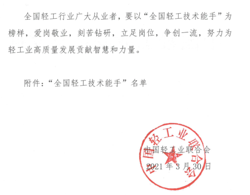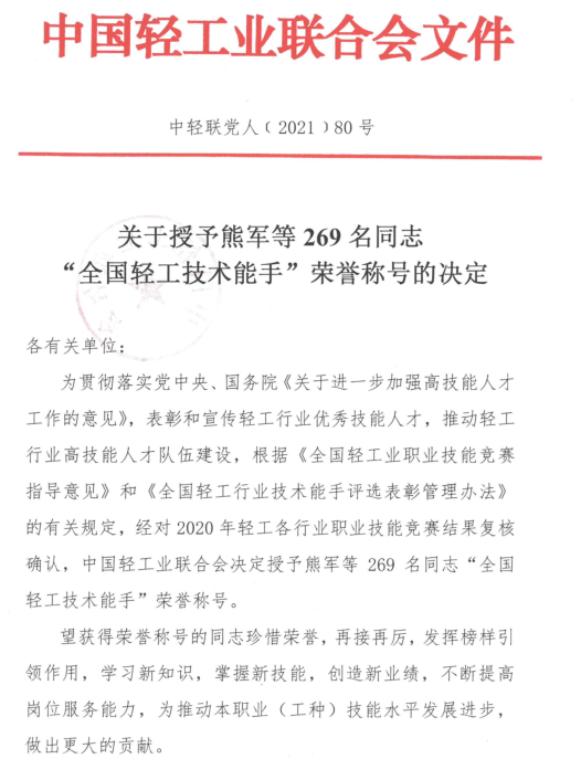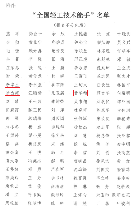 【技能竞赛】新会赛区三名选手被授予“全国轻工技术能手”荣誉称号