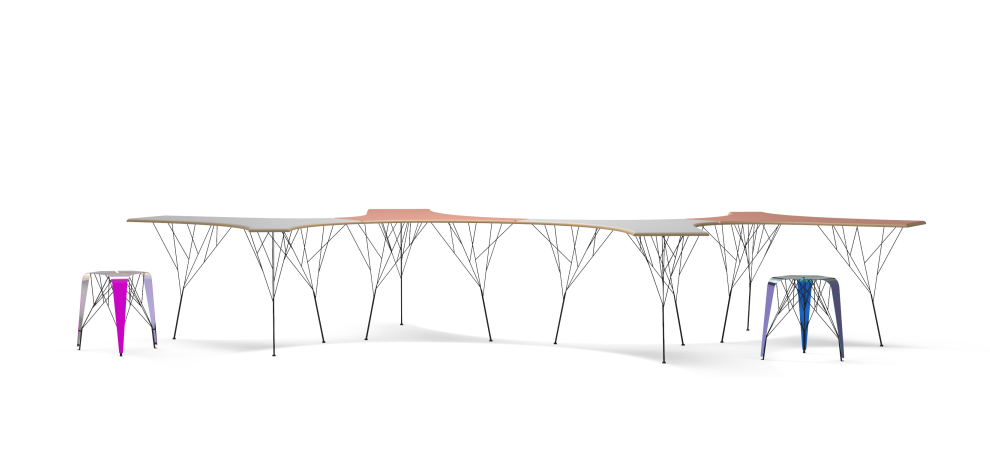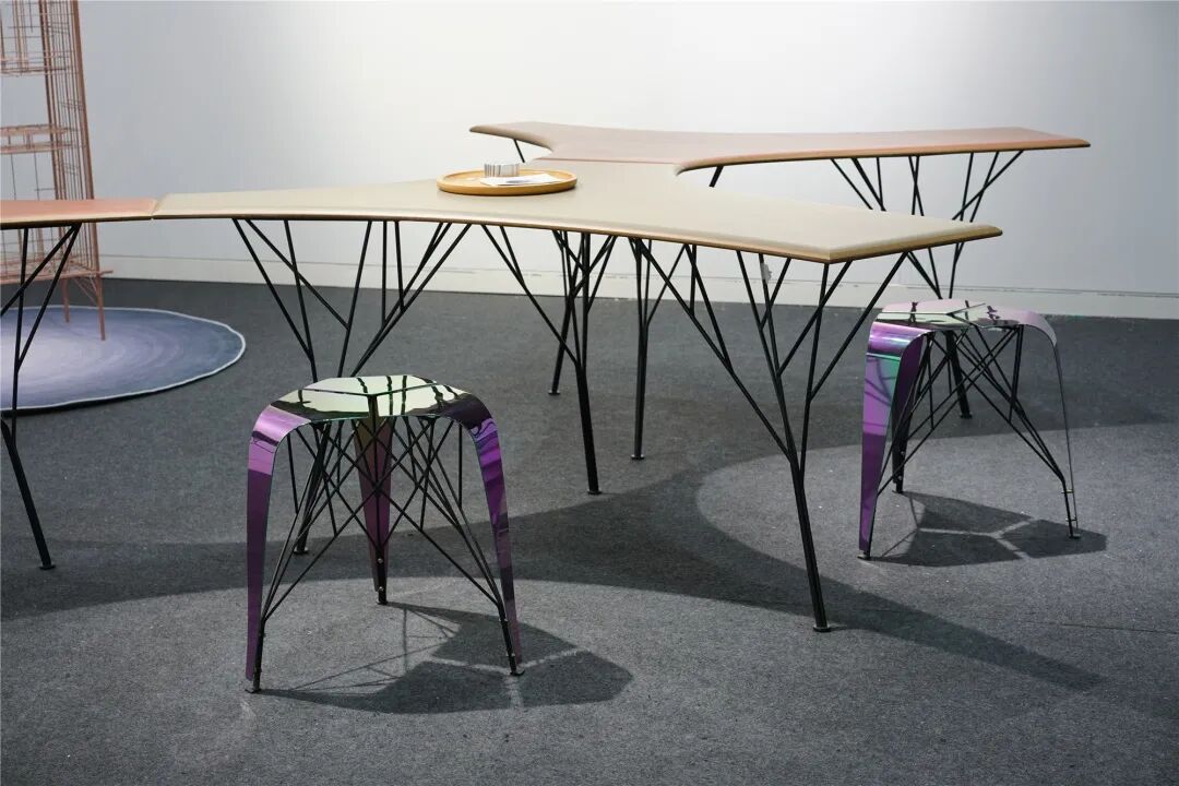 “数据森林”包含两件产品,“2012桌”和“2001凳”。数据森林的设计语言是“生长”,一个有顽强生命力的词汇。设计师希望错综复杂的钢筋像树一样生长蔓延开来,托住桌面或座面。“2012桌”使用镜像的几何手法实现多个桌面的组合排布,桌面材质使用零甲醛彩色密度板。“2001凳”的坐面以机甲为灵感,运用3块面组合而成。坐面采用金属电镀实现不用光和不用角度下的颜色转换。
