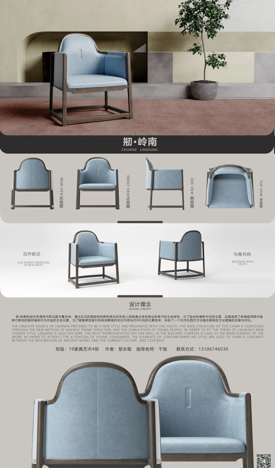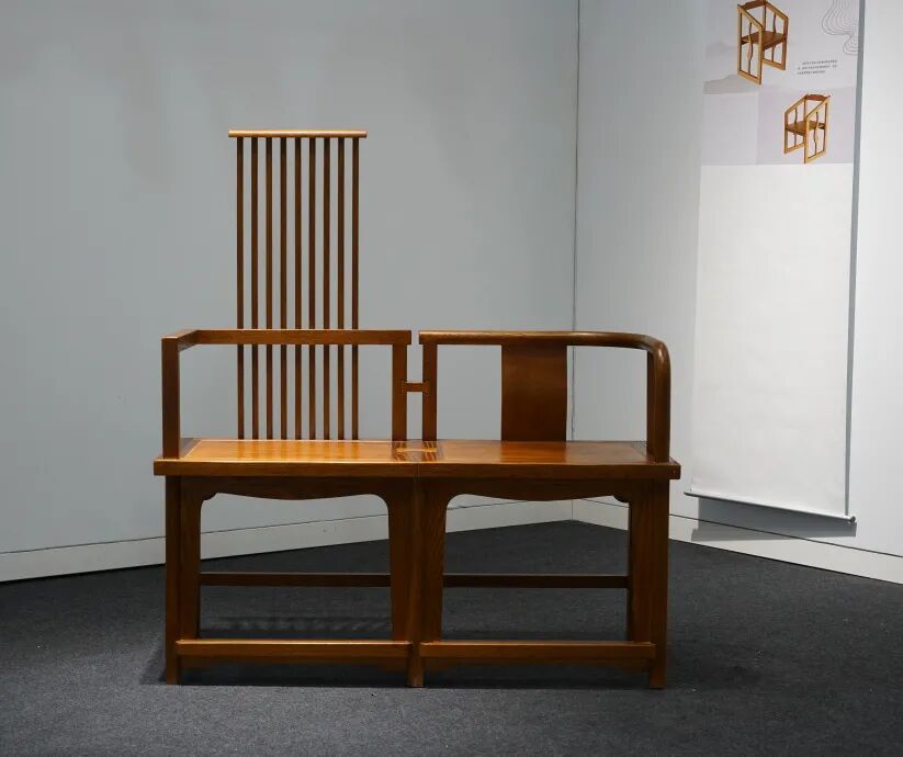 剏·岭南的创作来源于古作新式跟与青共鸣,通过古式的框架结构新的做法和年青人的刺激点来构思这张椅子的主体构架,为了贴合岭南新中式的主题,选用了岭南建筑群中最有代表性的镬耳墙来作为作品的主体元素,为能吸引更多年轻消费者的关注引用当代INS风元素进来,形成一个古作东西方文化融合跟现代文化碰撞的反差与对比。
