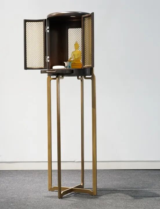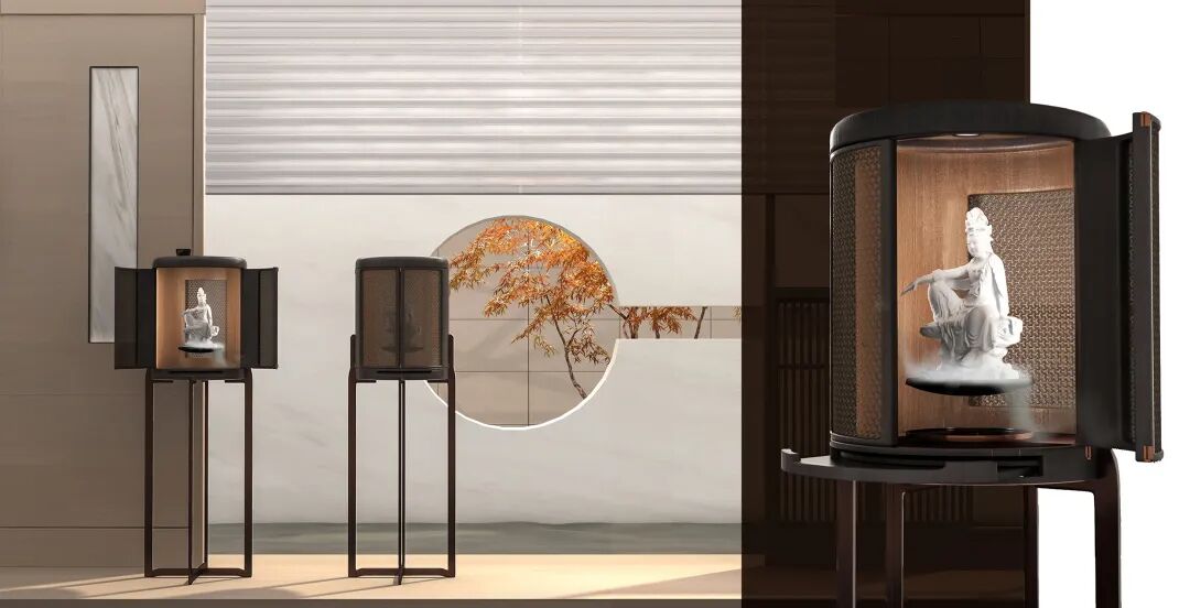 此设计将神的尺度变小,用小型花架的形式承托,将神佛人性化,置于我们的日常生活中。同时利用现代的悬浮技术,让神像悬浮起来,似乎是重新回归神性。在功能上,安置感应灯和雾化器,以渲染气氛。当人走进佛龛,静定几秒钟,以示赤诚,灯光才会亮。底部设置托盘抽屉,方便焚香、置物。无论是在物理层面和感官层面,都给与消费者更多体验。
