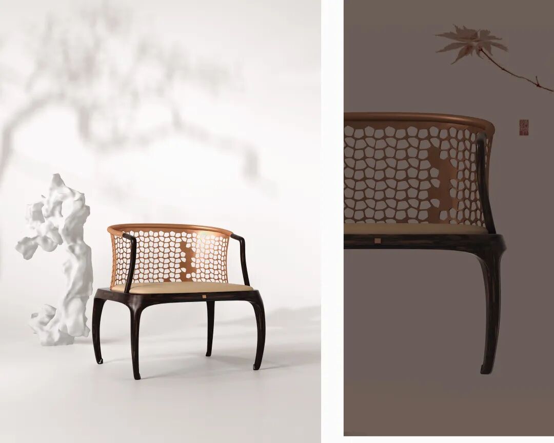 设计上以传统的圈椅和鼓凳为原型。靠背通过五金的镂空,将假山石融入到设计中,形成虚实的变换效果。