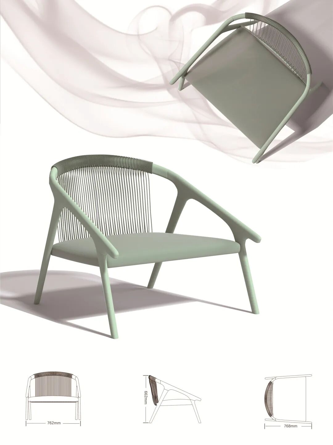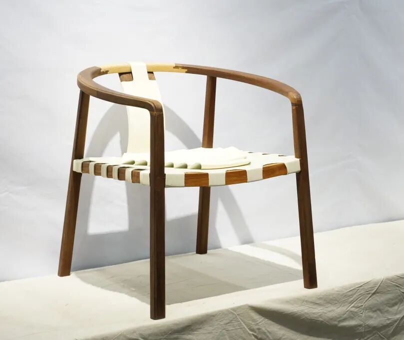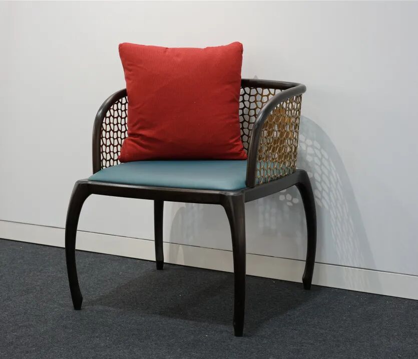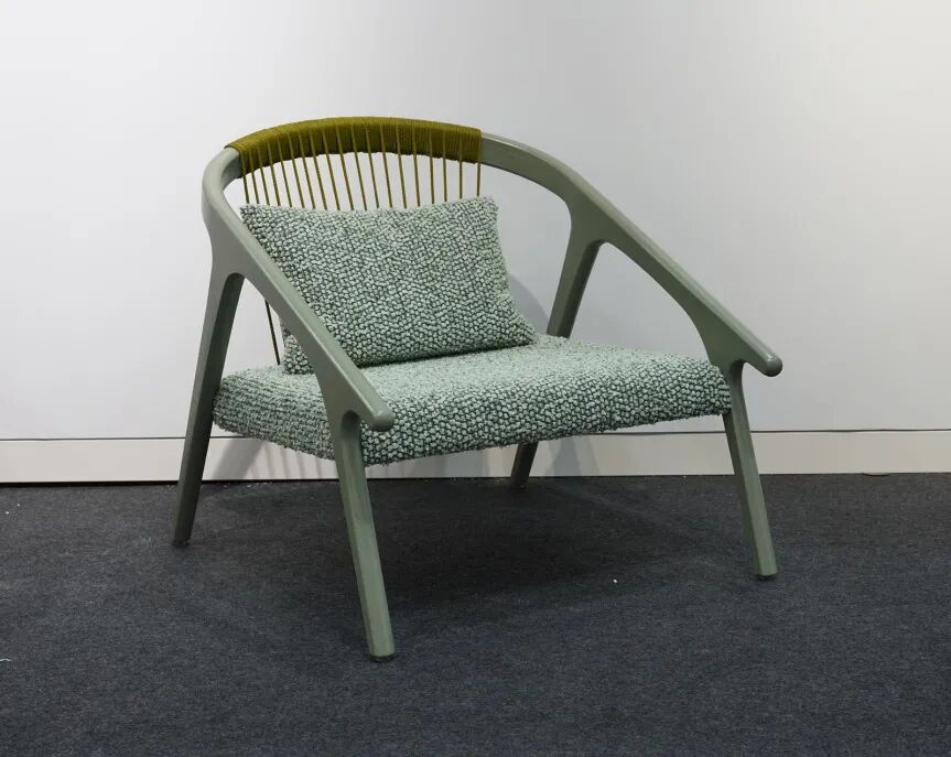 作品“千丝万缕”受传统編织家具和现代休闲椅的双重启发,将柔和的曲线木材与包和藤条结合在一起,在任何空间都能为之增添特色。