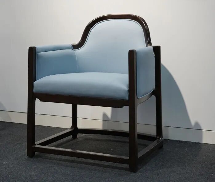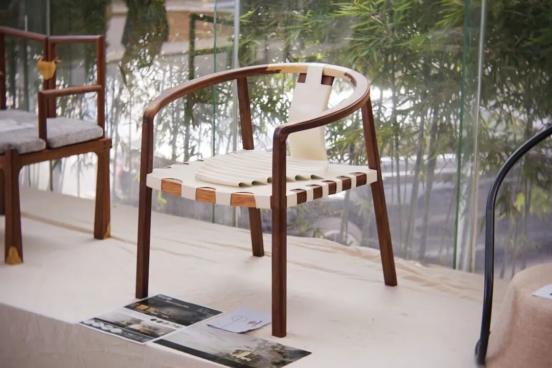 “诚椅”为茶椅,在设计的外观上依旧沿用的是圈椅的外形,保留了圈椅带给人特有的围合感。在木材上运用了深浅两种木材进行拼色;除此之外,在家具中也进行了皮的运用,大胆的提取现代服装设计的素,进行巧妙的缝制与设计。而坐面皮的造型就像是一条条弯弯的河流,贯穿着家具,既有茶室空间使用元素的表达,也兼顾了家具的细节。