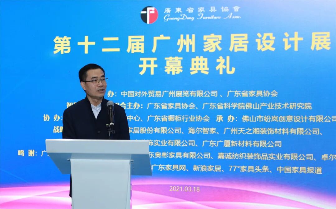 一年之计在于春,设计引领正当时。3月18日,由中国对外贸易广州展览有限公司和广东省家具协共同主办的第十二届广州家居设计展在第47届中国(广州)国际家具博览会上揭幕。中国对外贸易中心副主任徐兵,广东省第十三届人大代表、广东省家具协会会长王克,广东省科学院佛山产业技术研究院院长肖仁俊,广东省商务厅副厅长马桦,广东省工信厅消费品工业处调研员方乐羽,中国家具协会副理事长张冰冰,中国家博会负责人杨华伟,广东省商务厅对外贸易处处长孙斌,广东省橱柜行业协会会长徐秀华,广东省家具协会执行会长兼秘书长张承志,广东省家具协会执行会长:尚品宅配总经理李嘉聪、百利集团董事长梁纳新、新达高梵公司总经理何广经,广厦新材董事长李茂泉,海尔智家广州总经理褚健中、总监刘德权,天之湘材料董事长刘承恒,顺德职业技术学院设计学院院长姚美康,广州美术学院徐岚博士,广东省科学院佛山产业技术研究院主任陈峰等出席了本届设计展开幕式。
