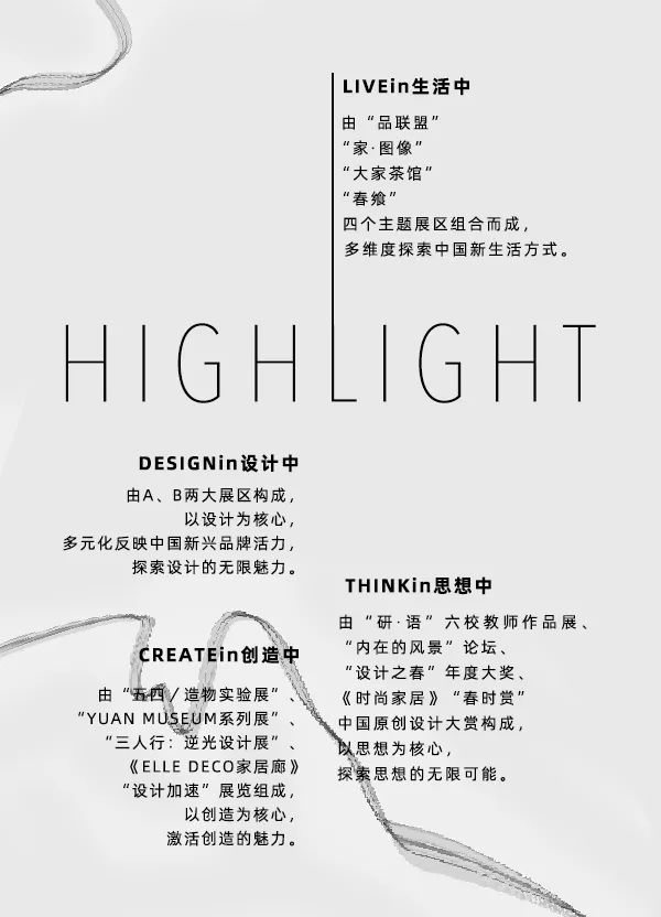 联动4.2、5.2CIFF“设计之春”当代中国家具设计展,中国家博会在A区2楼设1.2设计定制/智能家居馆、2.2整体设计馆、3.2现代设计品牌馆,五个展馆共同打造为设计展区。