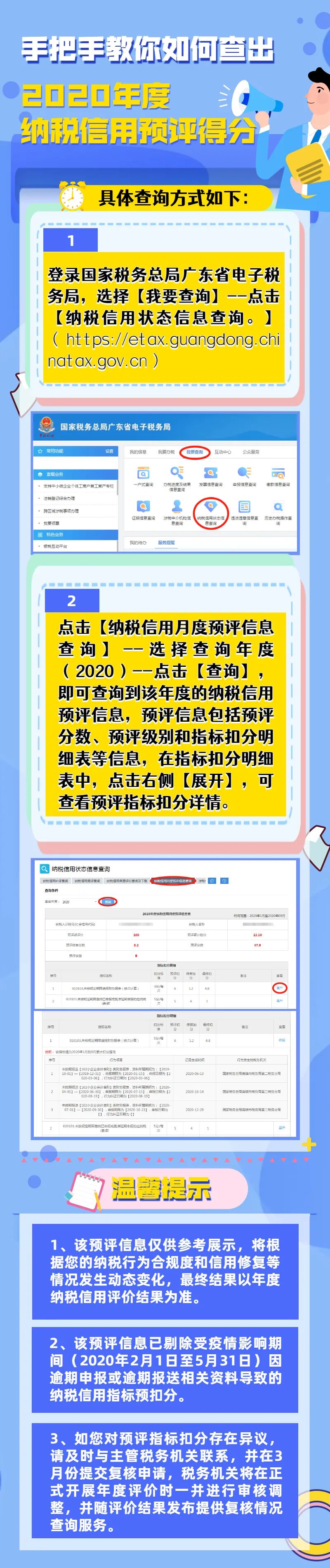 为持续优化纳税服务,全力保障纳税人权益,提供便利服务举措,营造诚信公平的营商环境,国家税务总局广东省税务局为您提供了2020年度纳税信用预评信息查询服务,请您及时关注,维护好企业自身纳税信用,查询途径如下: