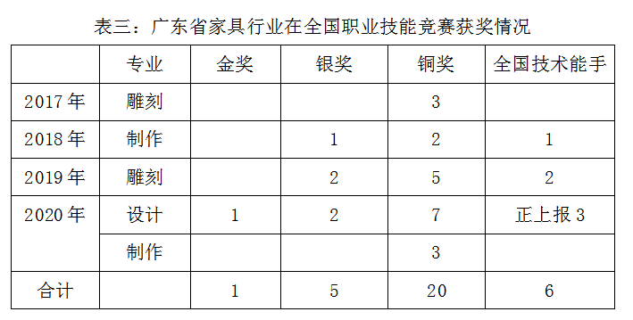 (一)筹备成立绿色家具产业联盟。为促进绿色家具产业的健康稳步发展,积极响应国家质检总局“质量提升”、与省政府签署推动广东质量强省备忘录的要求,协会牵头成立绿色家具产业联盟,首批企业33家。由会长王克担任组长,由省涂协黄开、省林产协会黄国如、国家家具质检中心海凌超、国家涂料质检中心陈纪文、中诚认证张玫担任副组长。(二)召开专家委员会议、技术研讨会、环境治理座谈会。制定《联盟成员评定办法》、《入盟评定细则》,推动我省家具与涂料行业产业结构调整,促进水性涂料应用和绿色家具发展。(三)召开领导小组会议。制定《工作计划》,《企业评价规范》、《绿色家具产品通用技术条件》两项联盟标准草案。向国家质检总局、省质监局领导汇报有关绿色家具产业联盟工作,得到领导对绿色家具产业联盟项目的特色性、可行性、引领性、科学性的充分肯定。(四)召开“标准升级·推动绿色家具创新发展”座谈会、产业联盟市场研讨会。发布了《绿色家具产品通用技术条件》、《绿色家具产业联盟企业评价规范》联盟标准,提升联盟影响力和公信力。(五)组织参加“环保家具木器涂装新技术交流会”。通过静电喷涂与水性漆涂料的应用、LED UV漆在木门涂装中的应用、智能涂装设备在家具、定制家居等行业的应用、工业涂装挥发性有机物全过程减排措施及案例分析等专题报告,为联盟企业推广绿色产品和前沿技术,明确发展方向。(六)召开家具行业智能化绿色发展重点技改项目现场会。以“传统产业智能化绿色发展技改之路”为主题,交流学习长江家具在绿色发展、智能化改造中的成果,在行业的绿色发展、智能化方面,形成“比、学、赶、帮、超”氛围,为广东从制造大省迈向制造强省做出家具行业应有的贡献。全力以赴、精心谋划,办好四届全国家具雕刻、制作职业技能竞赛选拔赛和总决赛。我们作为广东赛区主办方之一,牵头成立广东分赛区协调办公室,从策划、宣传、动员,到组织、实施,先后组织530多名选手参加各地选拔赛,圆满完成了南海、中山、新会、番禺、观澜等分赛区选拔工作。组织广东选手积极备战四届全国总决赛,共获得1金、5银、20铜奖好成绩,六名授予全国技术能手,为广东争了光、添了彩。1、我们主办、指导四个分赛区选拔赛。共160多名选手参赛。其中,深圳、广州赛区分别评出金、银、铜、优秀奖分别1、2、5、20名;江门赛区评出“工匠之星”金、银、铜、优秀奖分别1、2、5、30名;中山赛区88名选手参赛,职工组评出金、银、铜、优秀奖分别1、2、5、20名,院校组决出金、银、铜、优秀奖分别1、2、5、10名。2、精心备战总决赛,取得好成绩。广东四个赛区36名选手取得职工组铜奖3名、优秀奖15名、工匠之星奖12名,院校组青年工匠之星奖6名的佳绩。协会获“优秀组织奖”。1、我们主办、指导两个分赛区选拔赛。140多名选手参赛。其中,深圳、新会赛区56、88名,分别评出金、银、铜、工匠之星奖1、2、7、21/20名。5名获省人社厅授予“省技术能手”。2、精心备战总决赛,取得好成绩。广东深圳、新会9位选手获银奖1名,获国家人社部全国技术能手;铜奖2名、优秀奖4名、工匠之星奖2名。协会再次获“优秀组织奖”。1、我们主办、指导三个分赛区选拔赛。180多名选手参赛。其中,南海赛区61名选手参赛,评出“工匠之星”金、银、铜、优秀奖1、2、7、48名。新会赛区60余名选手参赛,产生金、银、铜、“工匠之星奖”1、2、7、20名。中山赛区63名选手参赛,职工组产生金、银、铜、优秀奖1、2、5、17名,院校组产生金、银、铜、优秀奖1、2、3、9名。2、精心备战总决赛,取得好成绩。广东选手勇夺2银、5铜。2名获国家人社部授予“全国技术能手”,可谓大丰收。协会第三次获“优秀组织奖”。1、由于新冠疫情,我们支持指导新会中山赛区开展手工木工选手遴选工作;并在全省开展家具设计制作选手推荐工作。2、28名选手精心备战家具设计制作总决赛,取得好成绩。其中,职工组广东选手包揽了1金、2银、七铜、11优秀奖的优异成绩,学生组广东选手获2铜、4优秀的好成绩。将有3名获国家人社部授予“全国技术能手”.3、12名选手精心备战,取得手工木工总决赛好成绩。来自新会选手勇夺3个铜奖、其余获得8个优秀奖的成绩。协会第四次获“优秀组织奖”。