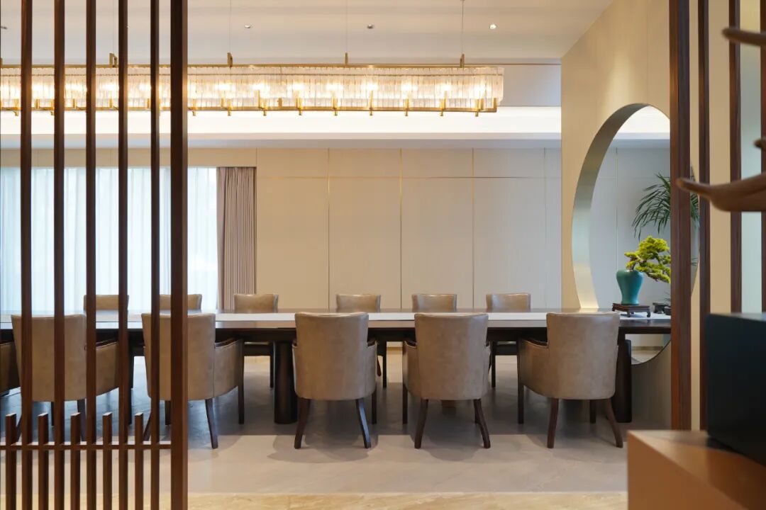 长达2米宽餐桌气宇轩昂,桌子中央定制山水景象,饮餐时光多一份赏心悦目。胭红色与木色、米色相互呼应,整体和谐自然。