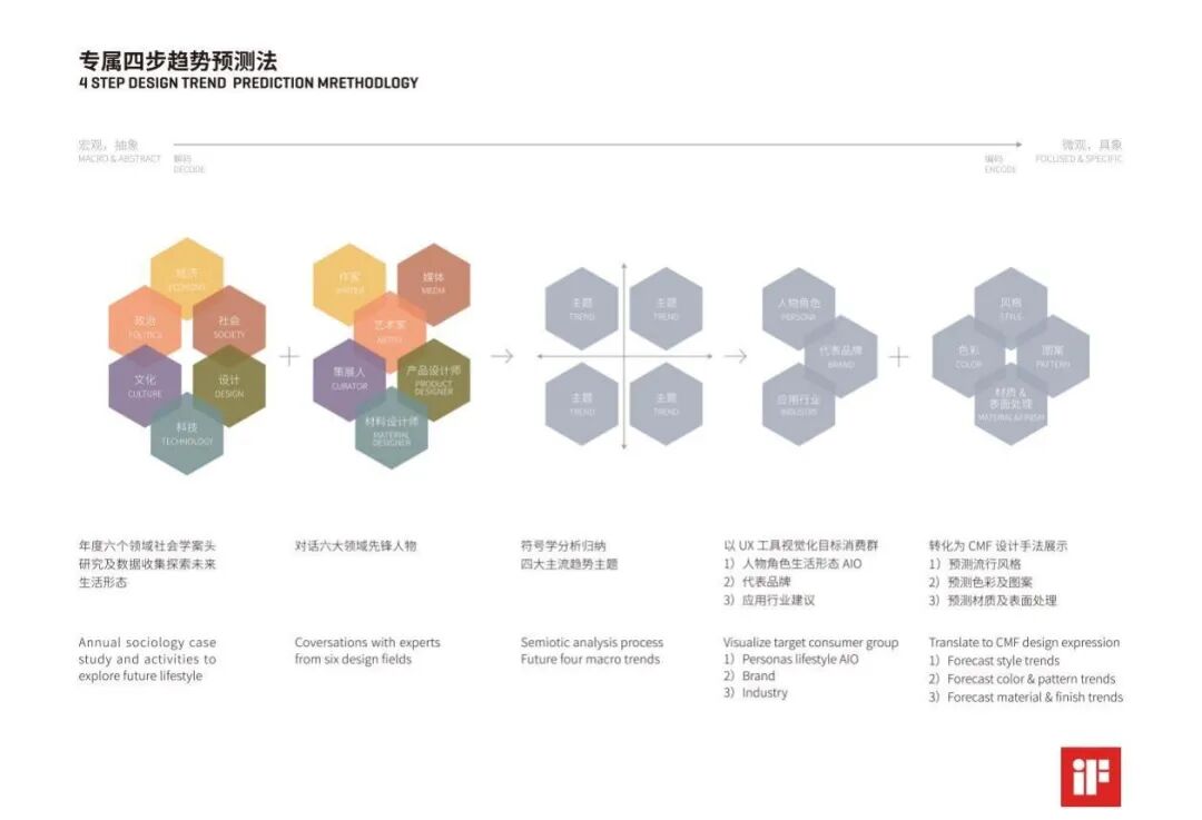 通过以上专属设计趋势四步预测法,我们把宏观、抽象、概念性的趋势背景,转化为微观、具象、可见的设计手法。从2020年起,这套趋势研究方法也被德国iF官网推荐给全球的设计师。