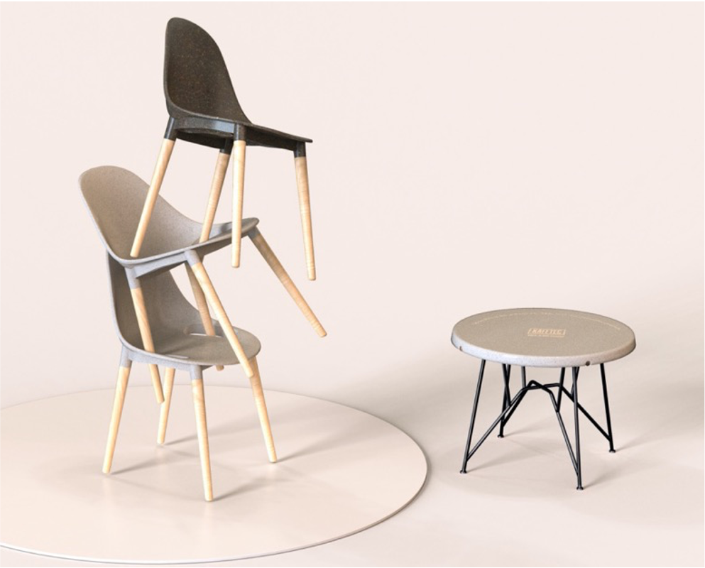 KAFFTEC咖法休闲茶饮桌椅采用了含45%咖啡渣的环保再生材料,质感独特,可满足多种使用场景,不仅适用于客厅等家居环境,也适用于户外庭院。