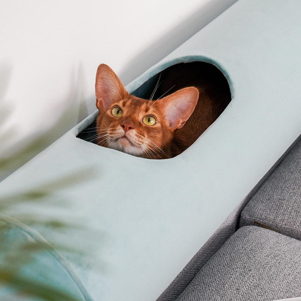 这把叫做“分享快乐”的椅子配有一个供人类放置书籍和茶杯或咖啡的侧桌,还有一个供猫随意休息的爬行空间。