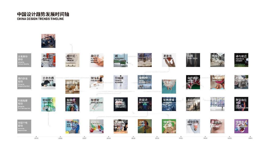 基于YANG DESIGN多年的实践经验,我们在《中国设计趋势报告》中采用了“专属四步趋势预测法”方法论。建立在对年度整体社会形态和消费趋势的研究、以及专家访谈的基础上,YANG DESIGN预测了符合中国人生活形态、适用于各行业的四大设计趋势主题,并对应每个趋势主题提出色彩、材质、表面处理(即Color,Material,Finish,简称“CMF”)的提案。