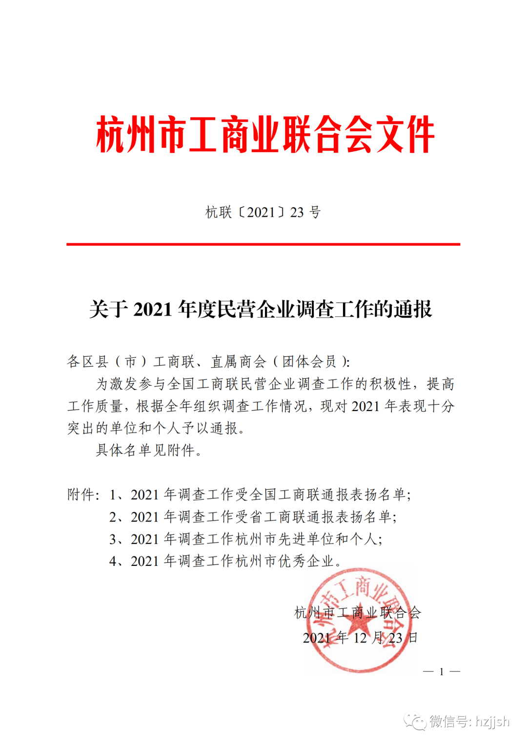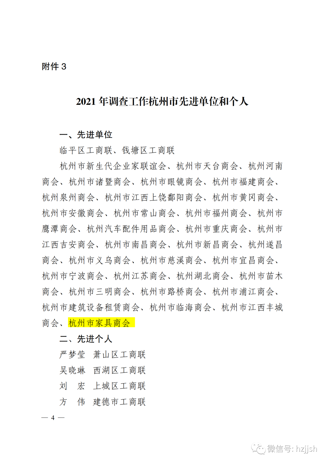 为激发参与全国工商联民营企业调查工作的积极性,提高工作质量,根据全年组织调查工作情况,杭州市工商联发布《关于2021 年度民营企业调查工作的通报》(杭联〔2021 〕23 号),通报了在全国工商联民营企业调查工作中表现十分突出的单位和个人。其中杭州市家具商会获评调查工作先进单位,秘书处韩燕萍评调查工作先进个人。