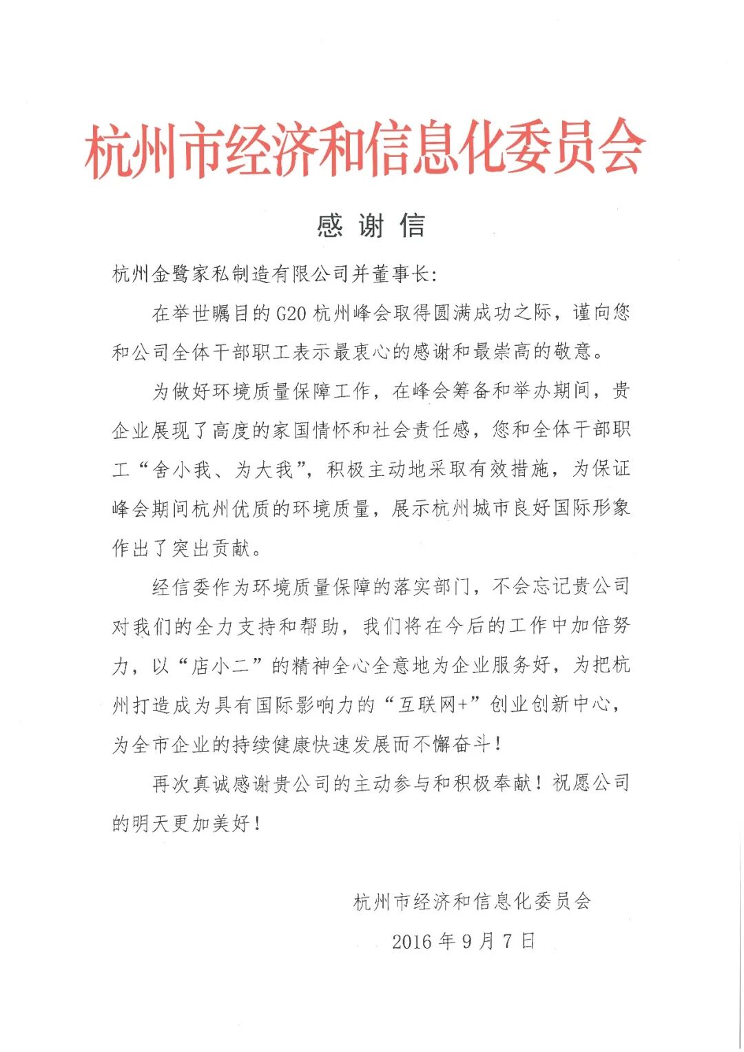 公司产品(服务)通过中国环境标志产品认证、中国环保产品认证、绿色供应链评价、家具产品环保卫士认证、家具产品有害物质限量认证、五星级售后服务等认证,为G20杭州峰会会场提供家具产品服务保障工作,获得了省、市政府部门的赞扬,同时收到杭州市经济和信息化委员会的感谢,肯定了我公司为峰会作出的积极贡献。