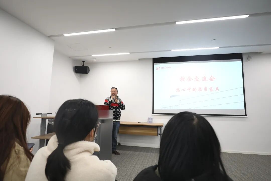在交流中,同学们踊跃发问,针对自己的专业以及恒丰的家具特点,提出一些自己切身关注的问题。徐总毫无保留地为同学们答疑解惑,还为同学们的职业规划提出了自己的建议。徐总提到,做任何行业都必须要热爱、专注,只有你热爱所从事的行业,才会主动去挖掘获取更多的知识,丰富和壮大自己的文化涵养。