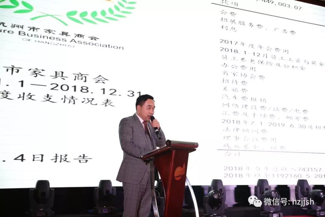 杭州市家具商会常务副会长郜定武作“商会2018年度财务报告”。自商会建立财务管理制度以来,秘书处严格遵守财务管理制度,每一笔费用都经过报批审核,做到资金使用清晰合理。