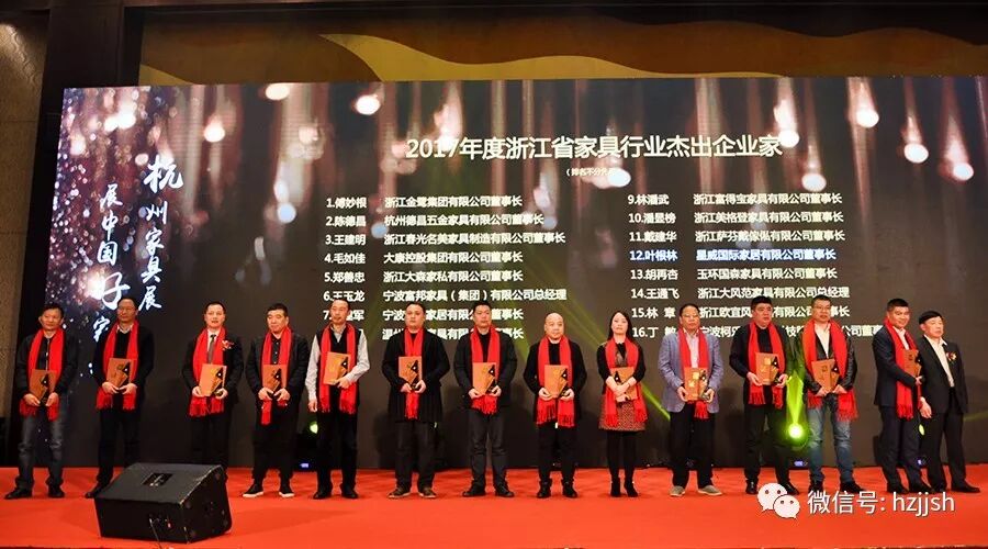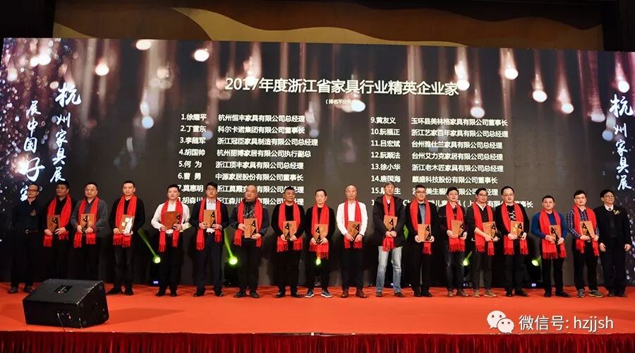 表彰杭州恒丰家具有限公司总经理徐耀平、科尔卡诺集团有限公司董事长丁雪东、浙江冠臣家具制造有限公司总经理李随军等2017年度浙江省家具行业精英企业家