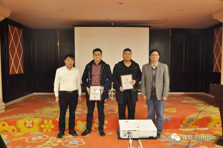 会议进入下一个议程,由浙江省家具行业协会名誉理事长蒋鸿源和商会会长傅妙根向新晋副会长和理事单位授牌。商会会长傅妙根向新晋理事单位杭州欧若拉家私有限公司授牌。由浙江省家具行业协会名誉会长蒋鸿源向新晋副会长单位科尔卡诺集团有限公司授牌。