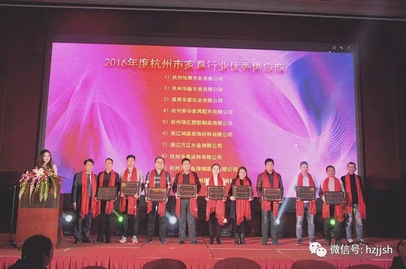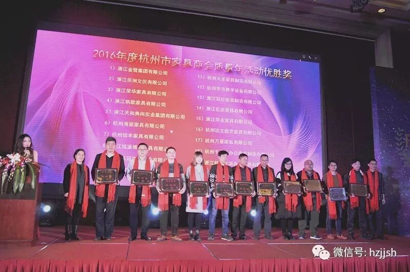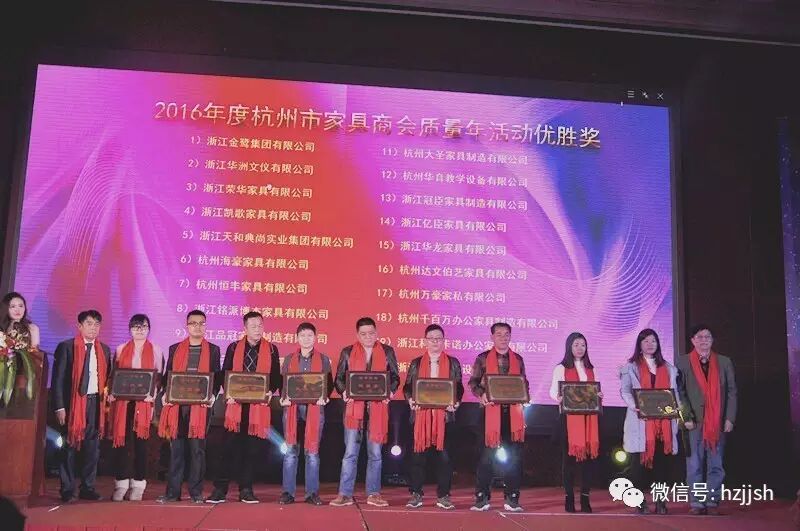 本次年会,对成绩优异的先进企业和先进个人进行了表彰。2016年,杭州市家具商会联合国家家具产品质量监督检验中心(浙江)共同开展“服务企业助力众创,提升杭州办公家具品质”的“质量年”系列活动。为表彰在本活动中取得突出成绩的企业,鼓励杭州市家具企业持续提升产品品质,经国家家具产品质量监督检验中心(浙江)同意,在综合评估企业质量年活动参与情况、政府监督抽查情况等基础上,由国家家具产品质量监督检验中心(浙江)和杭州市家具商会共同对浙江金鹭集团有限公司等20家企业授予“2016年度杭州市家具商会质量年活动优胜奖”。经研究决定对2016年度转型升级、创新进取的优秀企业、创新型企业和优秀供应商进行表彰,并希望各会员企业向先进企业学习,树立科学的发展观,在新的一年里创造出更多更好的成绩,争做家具产业的带头人。