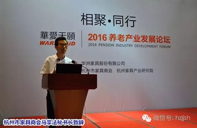 当天下午2点整,相聚·同行——华爱天颐《2016养老产业发展论坛》拉开序幕,特邀浙江省家具行业协会蒋鸿源理事长、杭州市经信委消费品产业处杨建强处长、杭州市家具商会马掌法秘书长给予开场致辞。