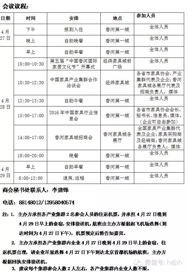 为进一步加强中国家具产业集群的合作交流,推动中国家具产业融合发展,中国家具协会、河北省家具协会、香河家具城定于4月28日至5月2日继续共同举办第五届“中国香河国际家居文化节”。有需要参加的企业请于2016年4月13日(周三)前与商会秘书处联系,由商会统一安排报名事宜。具体通知内容如下: