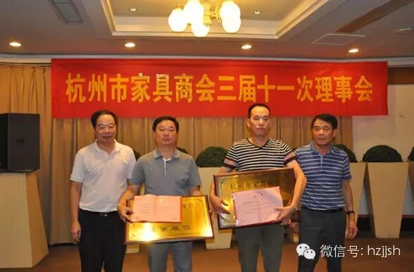 会议第二项,由商会傅妙根会长及市经信委消费品产业处杨建强处长为新申请加入理事会的浙江凯歌家具有限公司和德清德顺漆业有限公司颁发证书及授牌。