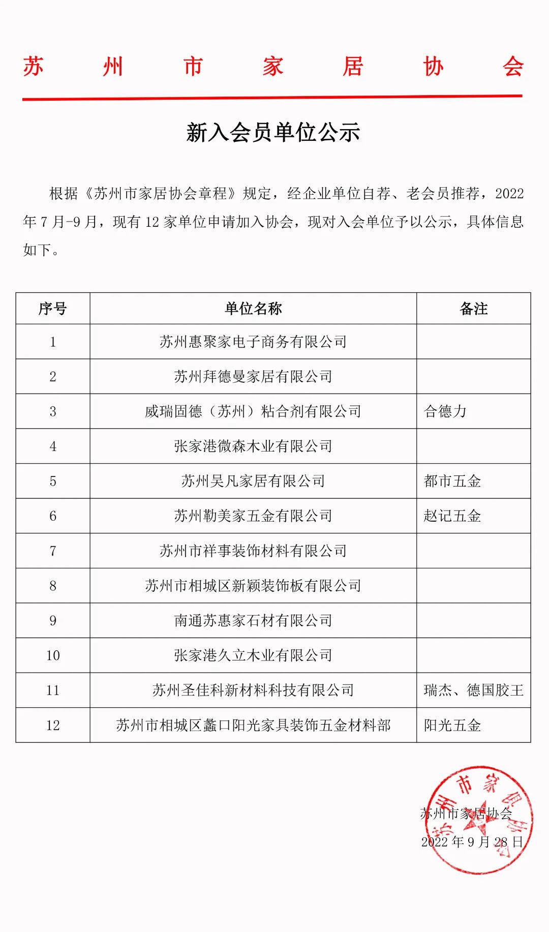 根据《苏州市家居协会章程》规定,经企业单位自荐、老会员推荐,2022年7月-9月,现有12家单位申请加入协会,现对入会单位予以公示,具体信息如下。