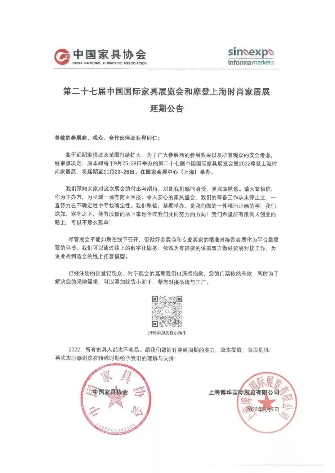 2022年9月8日,官方发布,由于疫情波及范围持续扩大,2022浦东家具家居双展再次延期,定档11月23-26日,在国家会展中心(上海)举办。
