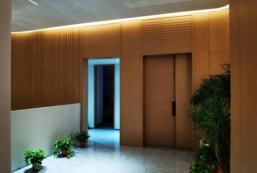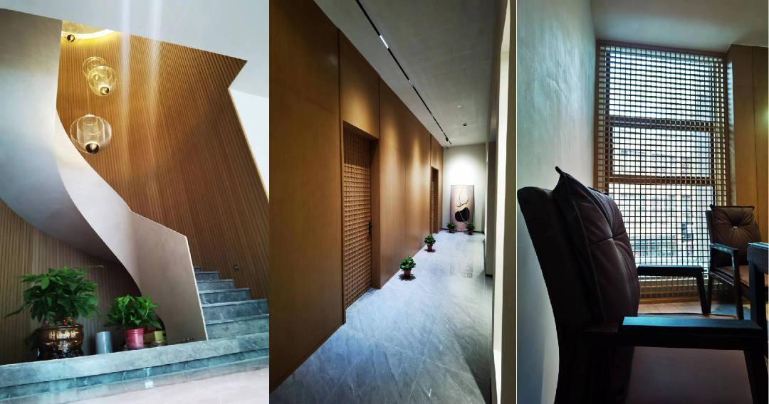 茶行整体统一色调及风格,采用天然木皮开放烤漆工艺,木门特有的表面格子样式,独具一格,圆弧形的楼梯,经过与设计师及客户的反复沟通,最终采用整体圆弧格栅工艺,极大的增加了工厂制作的难度,现场最高处达到7米的层高,对安装工艺也是一个大的挑战。