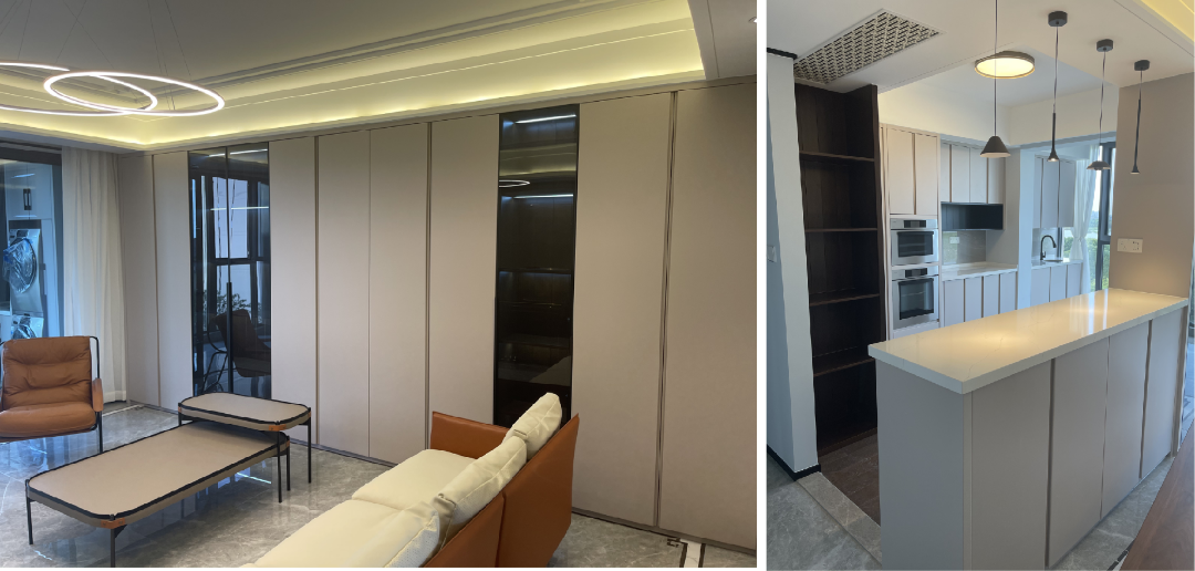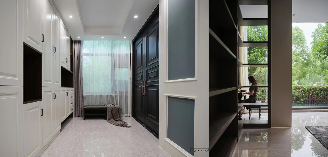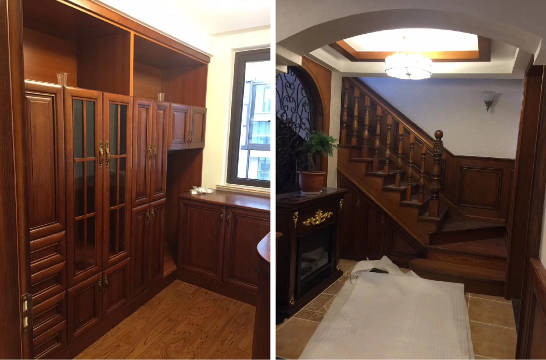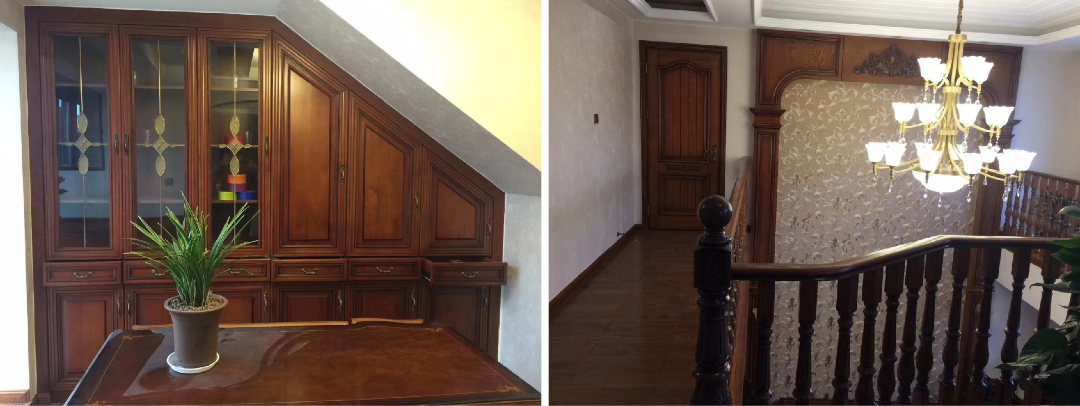 别墅含地下共四层,全屋木制品均由四叶草木业落地,采用整体实木烤漆工艺,工厂根据实木的特性,采用柜门拆装及榫卯工艺,预留伸缩缝,防止实木变形及开裂。根据客户定制要求,采用多种色彩变化,完美匹配,书柜做成可打开的结构,留出一个密室空间,各种工艺衔接复杂,最终也完美落地。