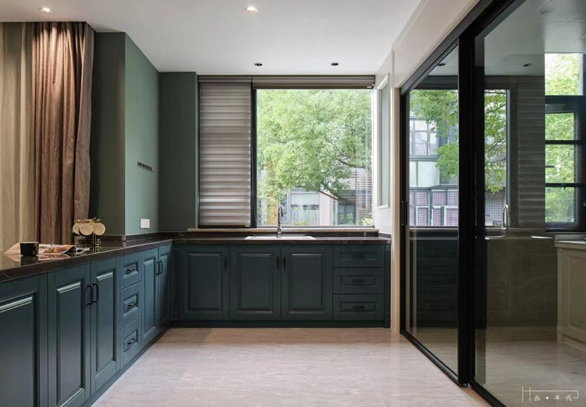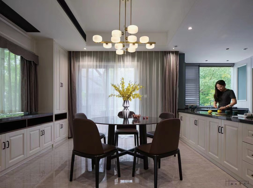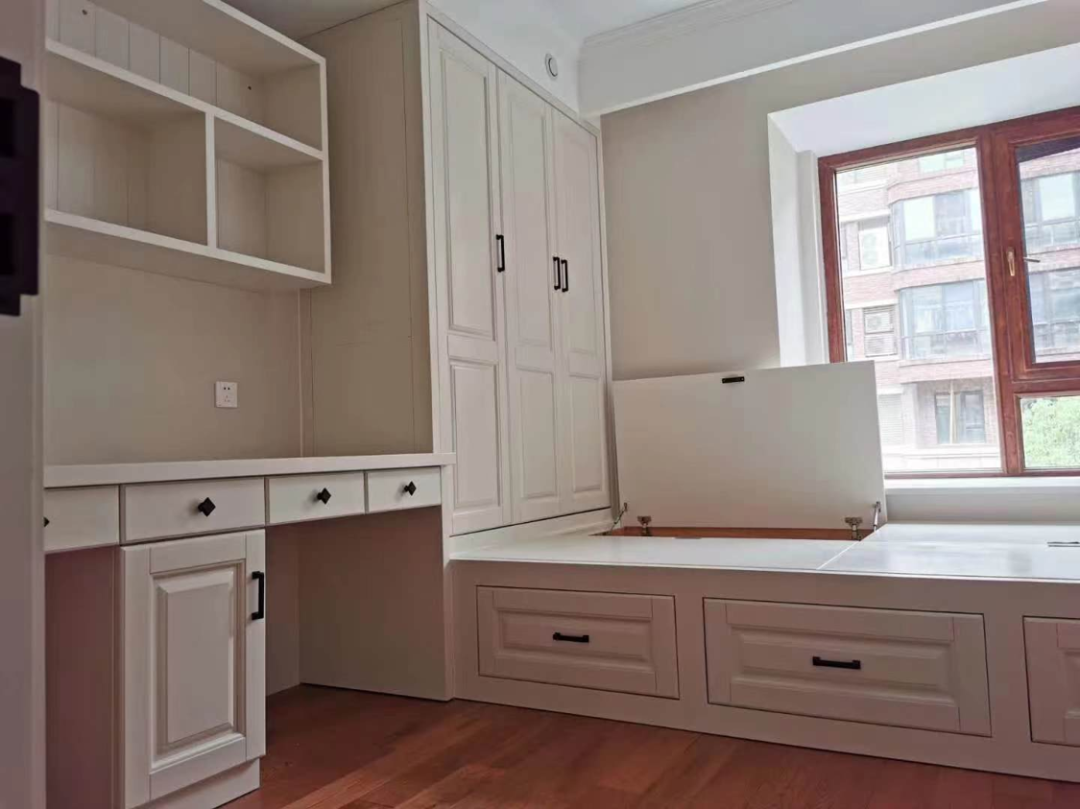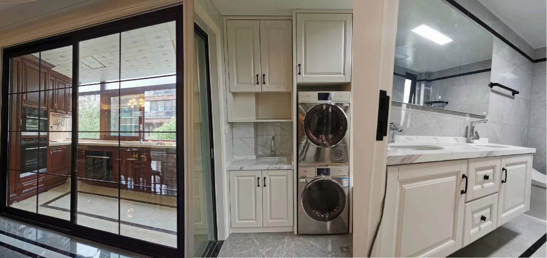 整体美式风格,厨房采用北美樱桃木清水漆工艺,保留了樱桃木自身高贵的纹理,并配合厨房多功能五金,不仅是效果更让厨房整体功能更加便利使用,其余整体采用泰国橡胶木整体奶白混油工艺,房间整体感觉比较温馨舒适。